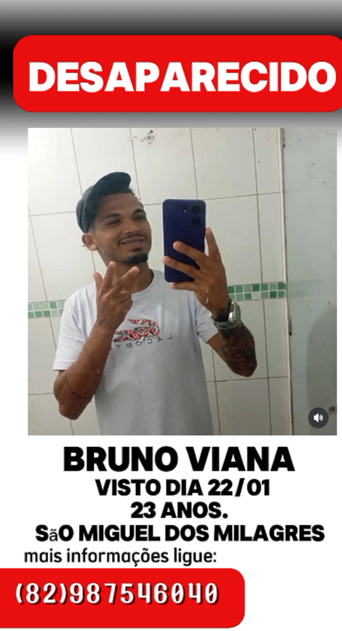 Quem tiver qualquer informação sobre o paradeiro de Bruno Viana pode entrar em contato diretamente com a família pelo telefone (82) 98754-6040. Também é possível repassar informações de forma anônima por meio do Disque Denúncia da Polícia Civil, pelo número 181.