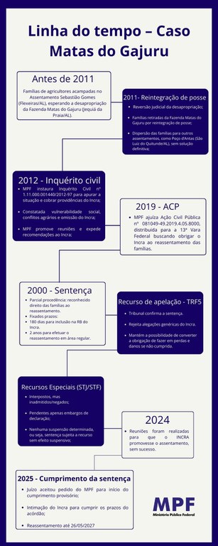 Dessas famílias, algumas foram realocadas em outros assentamentos; outras vivem em centros urbanos, permanecendo em situação de vulnerabilidade. O MPF, então, instaurou o Inquérito Civil nº 1.11.000.001440/2012-97 para apurar a situação e cobrar providências do Incra. Em 2019, após esgotar as tratativas com o Incra, ingressou com uma Ação Civil Pública (ACP), sentenciada em 2020, que determinou a inclusão das famílias na Relação de Beneficiários (RB) do Incra e sua priorização nos processos de assentamento.