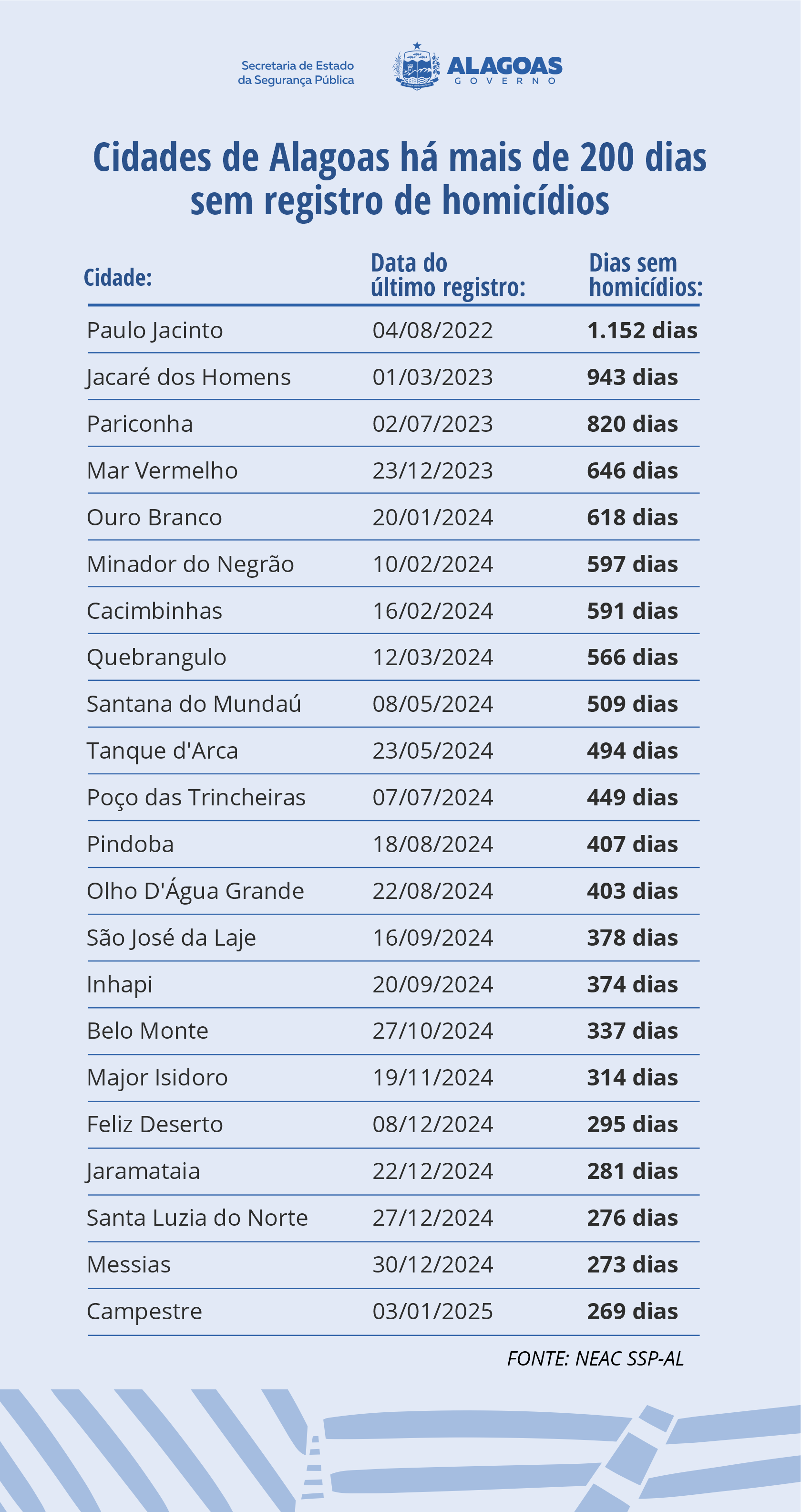 As três cidades do ranking com mais tempo sem mortes violentas, segundo levantamento do Núcleo de Estatística e Análise Criminal da SSP, são Paulo Jacinto (três anos, um mês e 27 dias), Jacaré dos Homens (dois anos e sete meses) e Pariconha (dois anos, dois meses e 29 dias). Confira a lista completa dos 22 municípios na tabela abaixo.