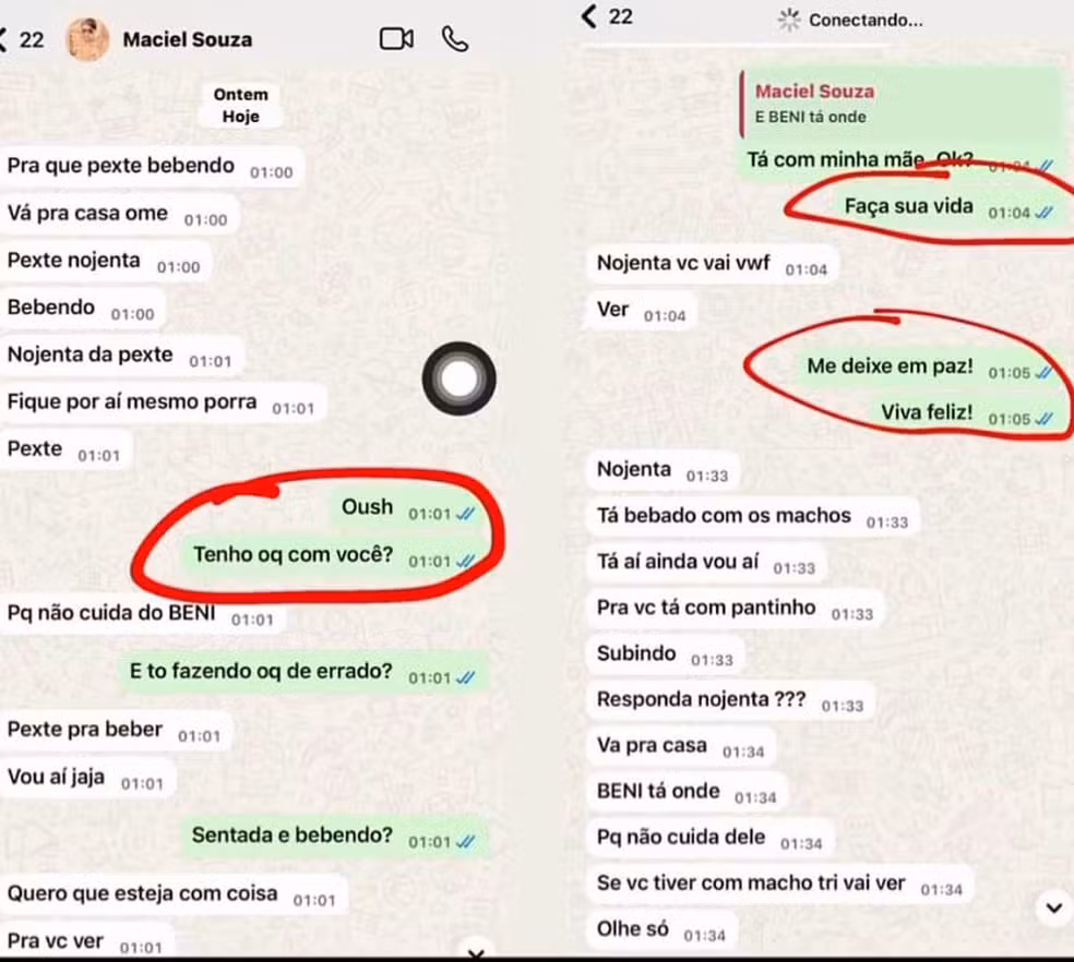 Imagens de conversas divulgadas pela defesa mostram que Maciel ameaçava a ex-companheira com frequência. Em uma das mensagens, escreveu: