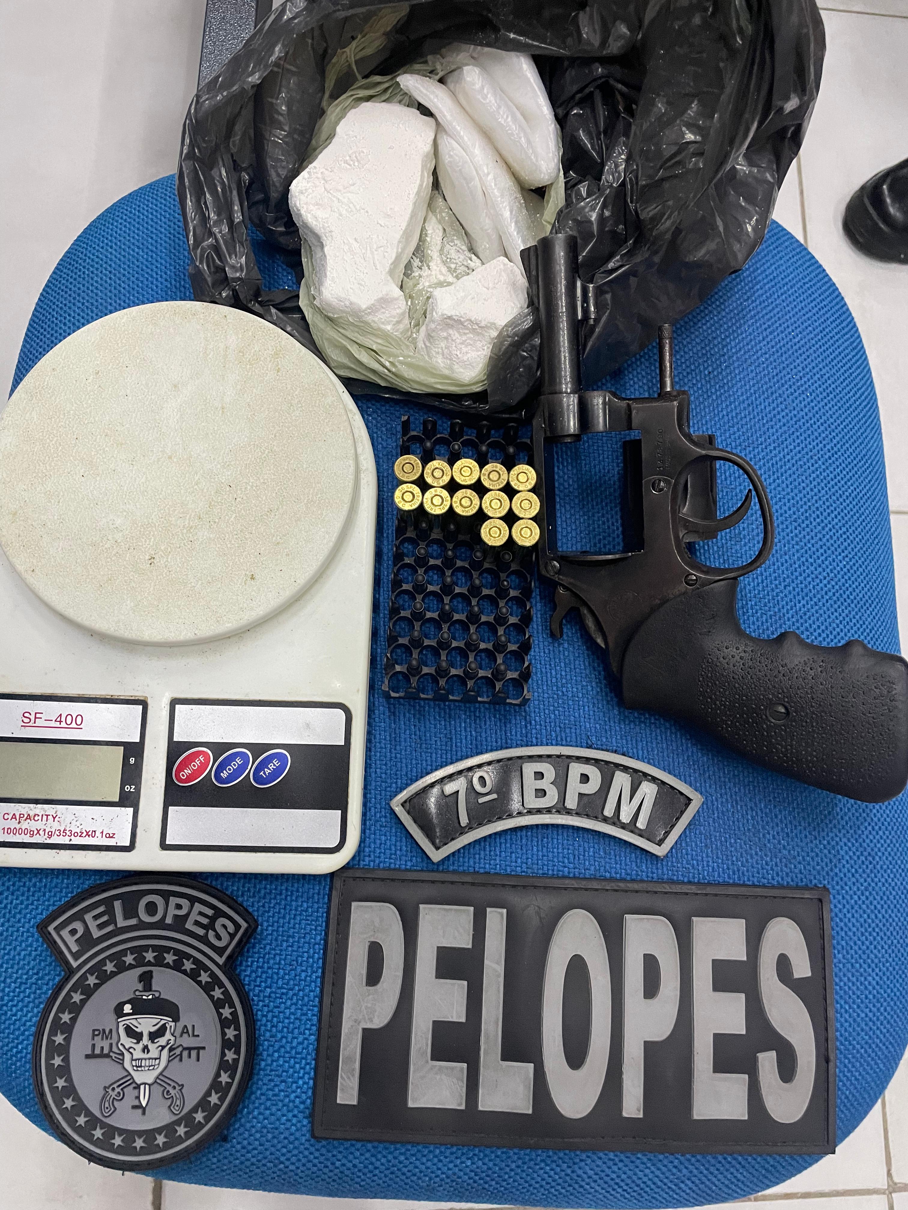 Um revólver calibre 38 com 12 munições foi apreendido pelo 7º Batalhão na cidade sertaneja de Senador Rui Palmeira perto das 23h de sexta-feira. Além do armamento, os policiais recolheram 150g de cocaína e uma balança de precisão e um homem foi preso.