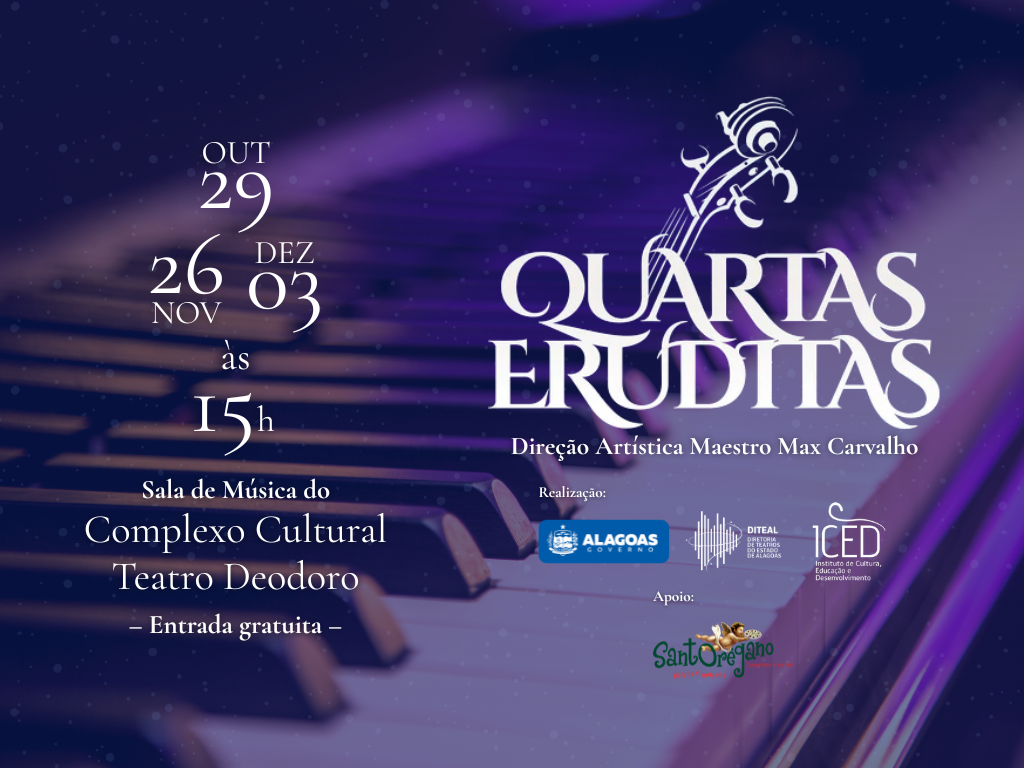 Fruto da parceria entre a Camerata Ero Dictus e a Diretoria dos Teatros de Alagoas (Diteal) e dirigida pelo maestro Max Carvalho, o projeto promove a interação direta entre músicos e alunos em uma experiência única de aprendizado. Nesta retomada, o Quartas Eruditas já tem três apresentações previstas ainda para este ano, nos dias 29 de outubro, 26 de novembro e 3 de dezembro.