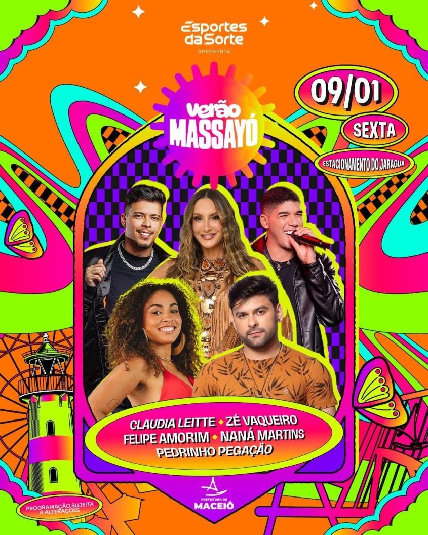 A edição 2026 do Verão Massayó começa nesta sexta-feira (09), no Estacionamento do Jaraguá, e transforma a orla de Maceió em um grande ponto de encontro para moradores e turistas. O festival segue nos dias 10, 11, 16, 17 e 18 de janeiro.
