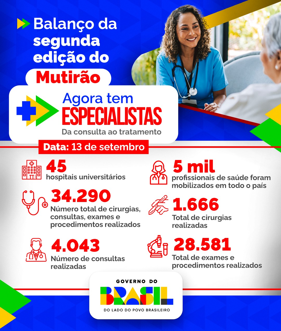 Com foco em áreas prioritárias do Agora Tem Especialistas, como oncologia, ginecologia, cardiologia, ortopedia, oftalmologia e otorrinolaringologia, o mutirão foi promovido nas cinco regiões. Para realizar os atendimentos, foram mobilizados mais de 4 mil médicos, enfermeiros, técnicos de enfermagem e outros trabalhadores, além de mais de 900 estudantes, totalizando cerca de 5 mil profissionais.